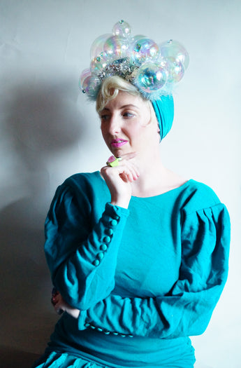 Iridescent plastic sphere bubble like balls arranged and attached to a teal fabric turban base. Jewels, and iridescent beads embellish the bubbles.