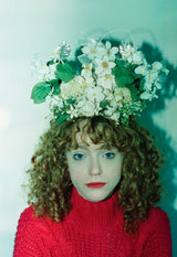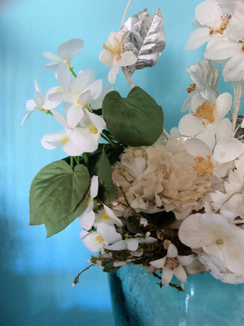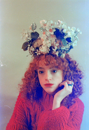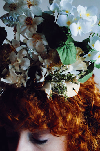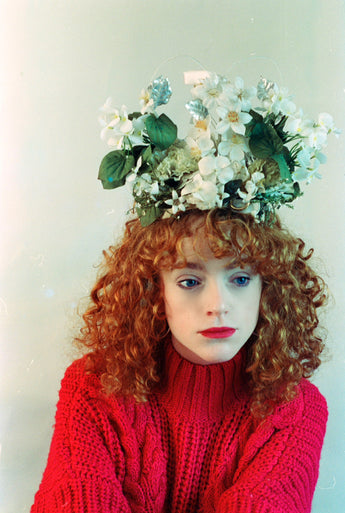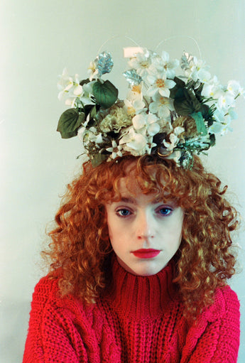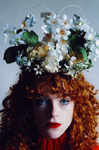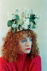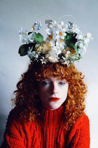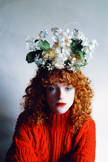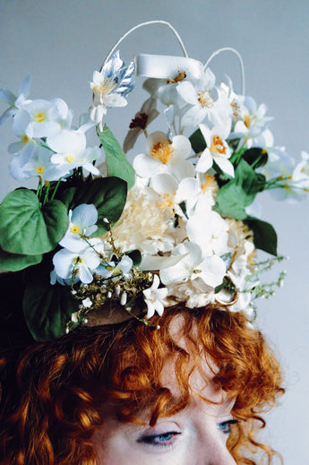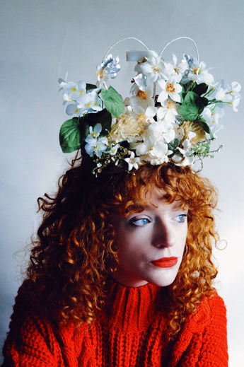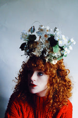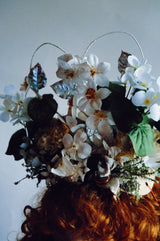 Delicate vintage flowers, buds and doves with a heart shaped wire centre. Made on a stiffened felt base and elasticated to fit any head size.