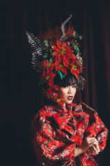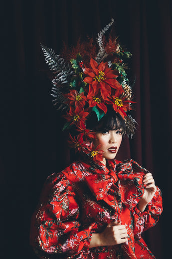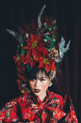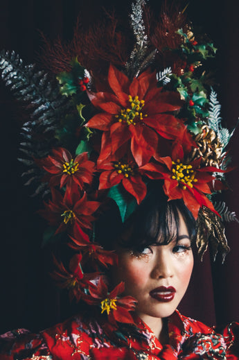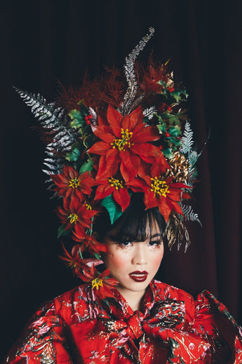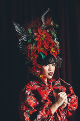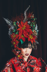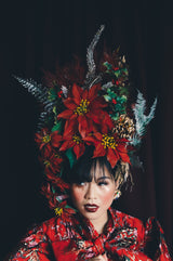 INCREDIBLE showstopper of a headpiece made up of vintage plastic poinsettias and green and silver foliage. Quite heavy, but secured with elastic for stability.
