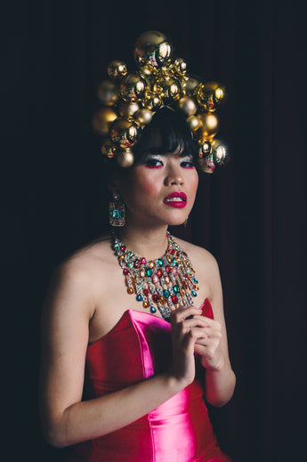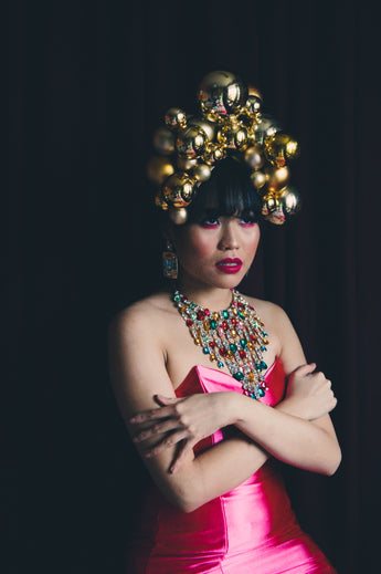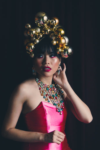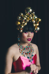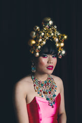 Super fun Gold bauble headpiece. Sits quite far back on the head and secures with elastic. Lightweight and comfortable -  the perfect Christmas accessory!