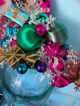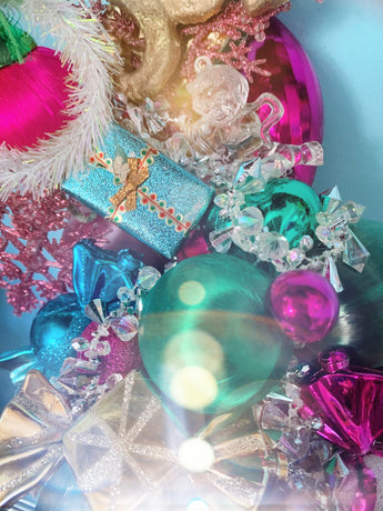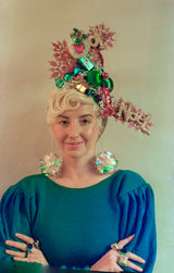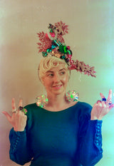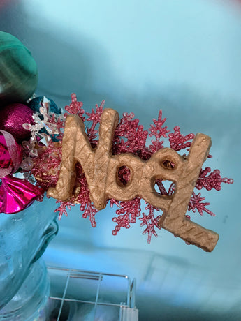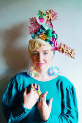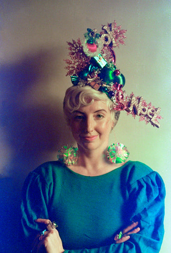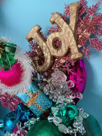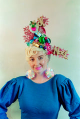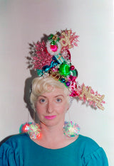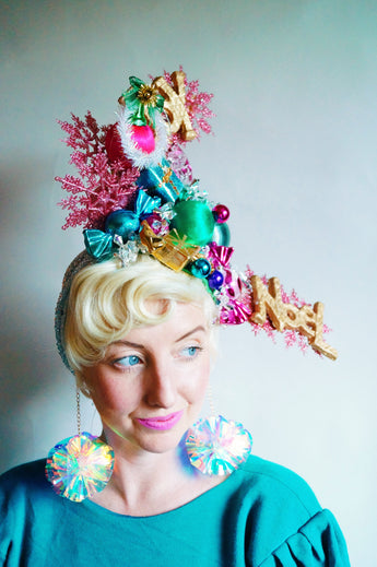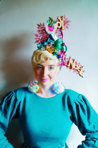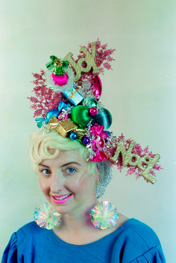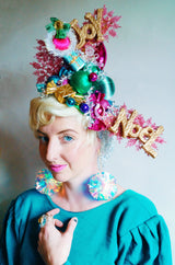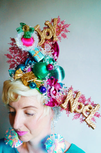 OTT super fun and kitsch Christmas Headdress made up of vintage baubles, snowflakes, beads and giant JOY and NOEL signs. Can be worn on the top or side of the head. Fitted with elastic which sits at the nape of the neck - Lightweight and comfortable to fit any head size.
