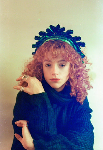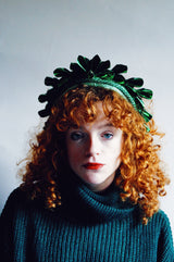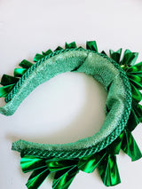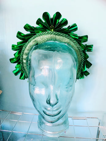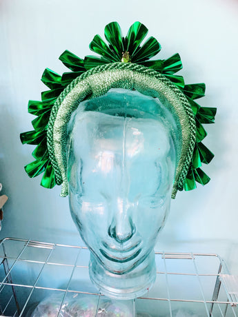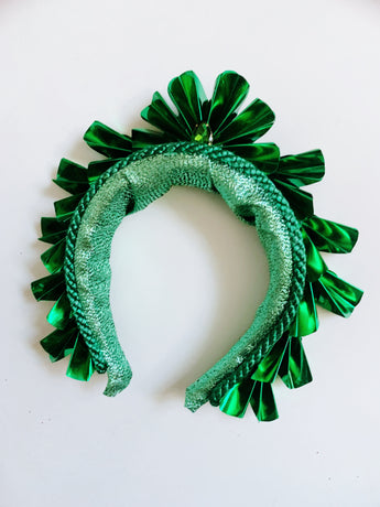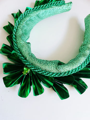 Striking Metallic Origami crown. Each segment is hand cut and folded to make the crown shapes before being adorned to a lame covered padded headband and finished with a central gem.