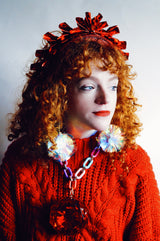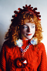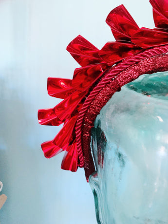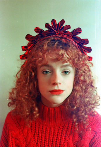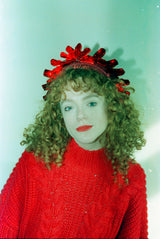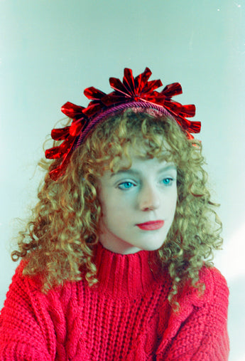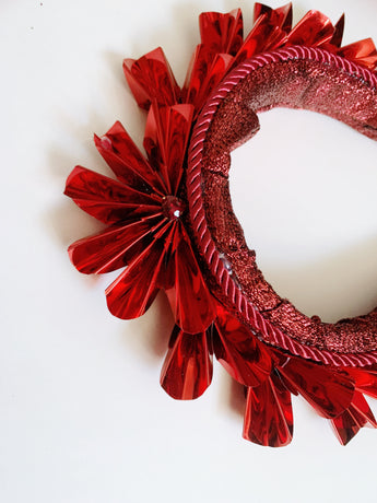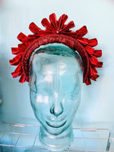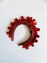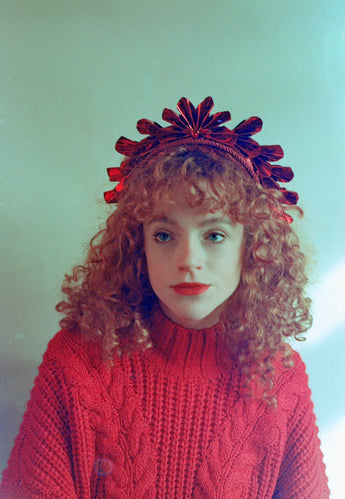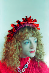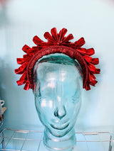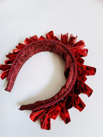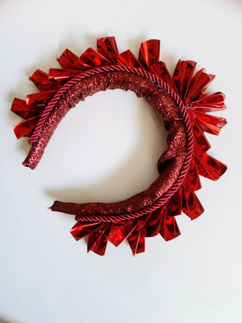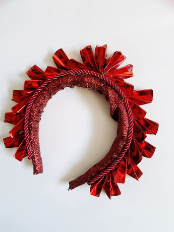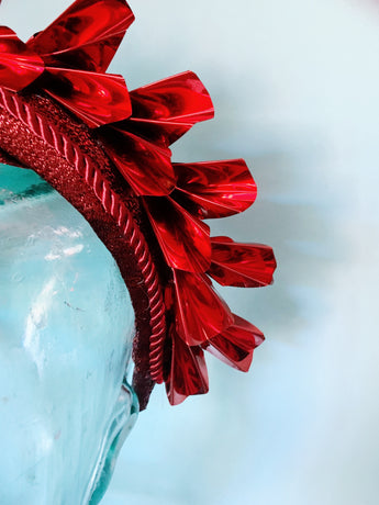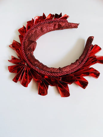 Striking Metallic Origami crown. Each segment is hand cut and folded to make the crown shapes before being adorned to a lame covered padded headband and finished with a central gem.