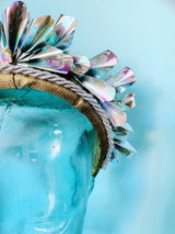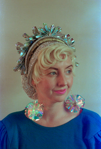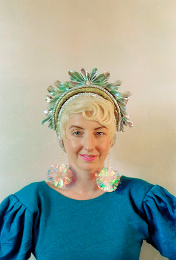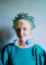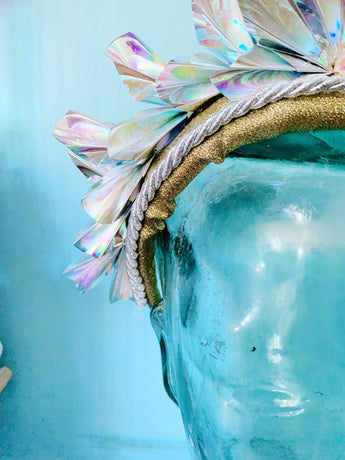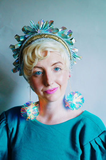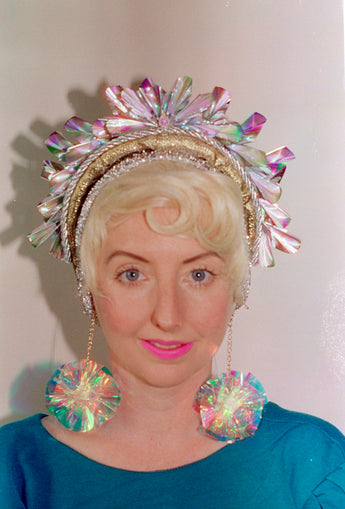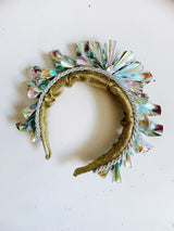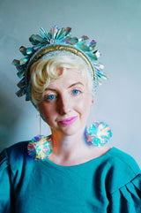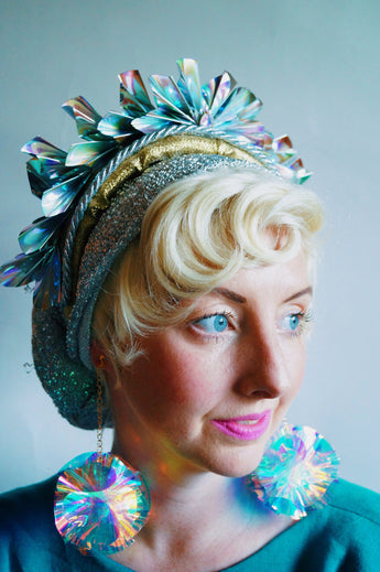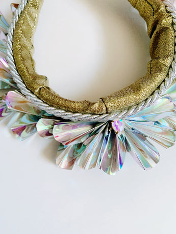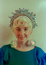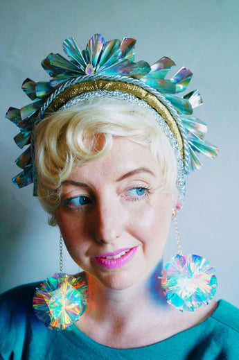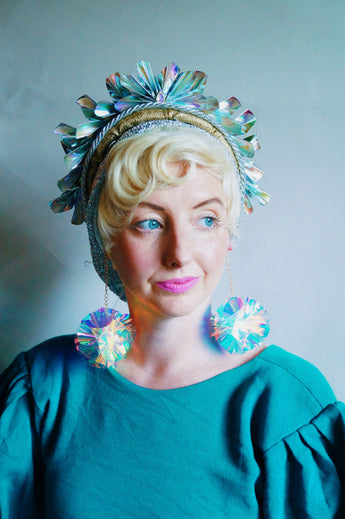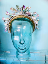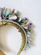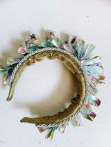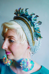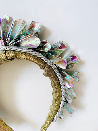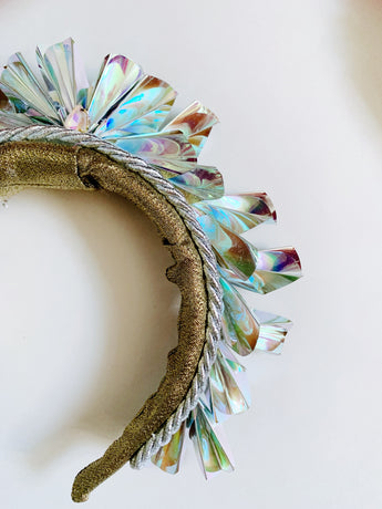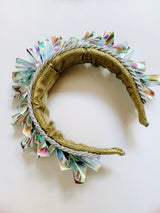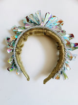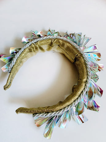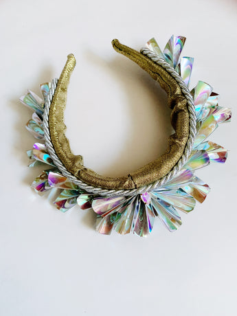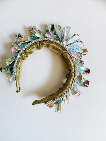 Striking Metallic Origami crown. The colours in the holographic shine silvers, blues, pinks, purples and yellows depending on the light. Each segment is hand cut and folded to make the crown shapes before being adorned to a lame covered padded headband and finished with a central gem.
