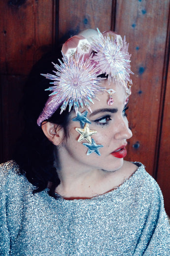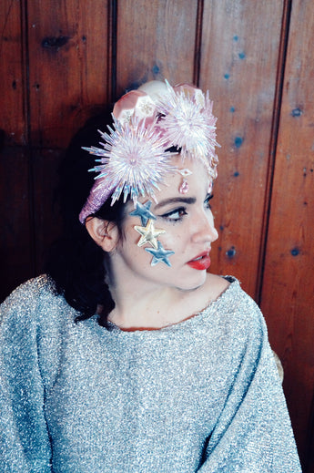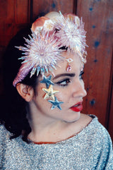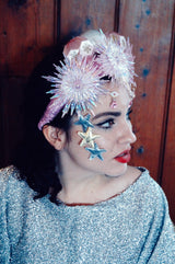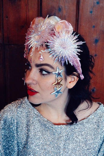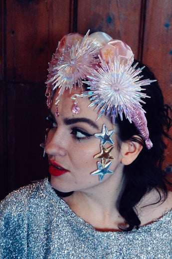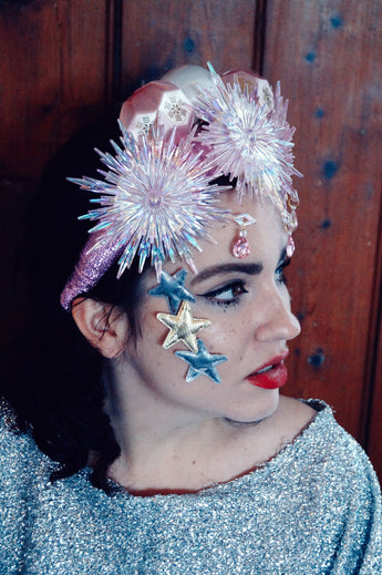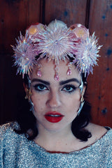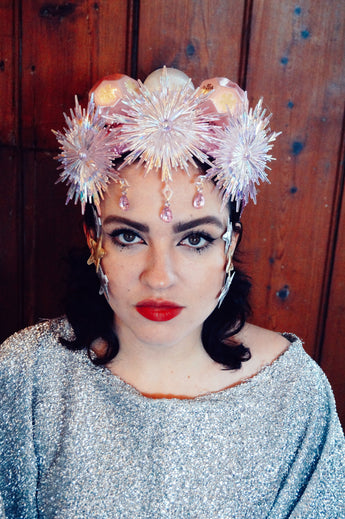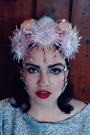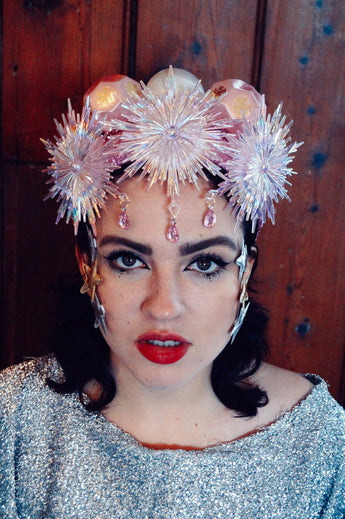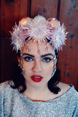 Pink and iridescent crown with snowflakes, silk baubles and dripping jewels. Set On an alice band.