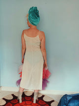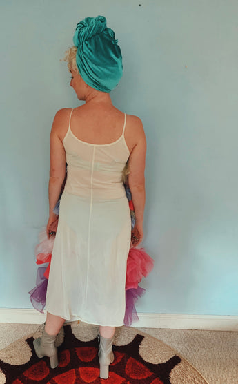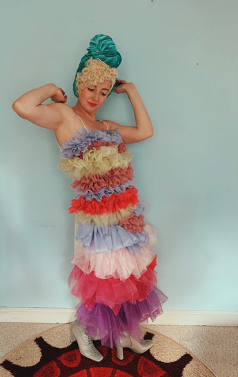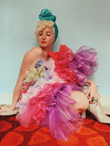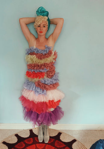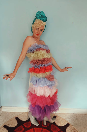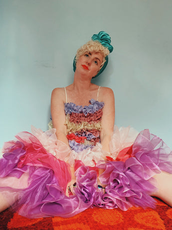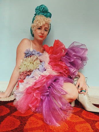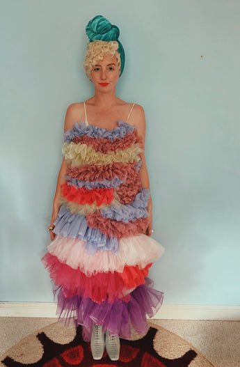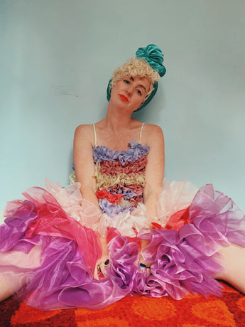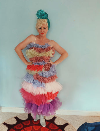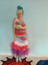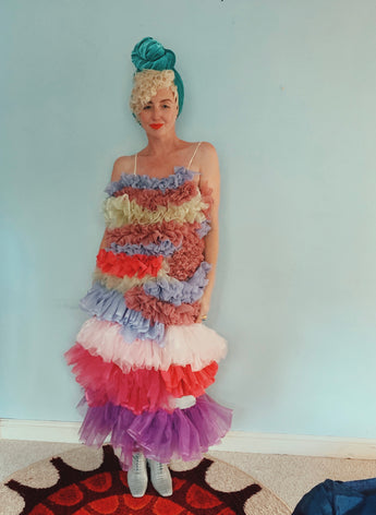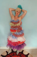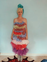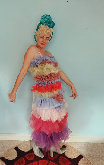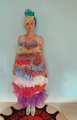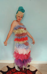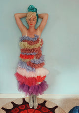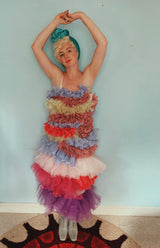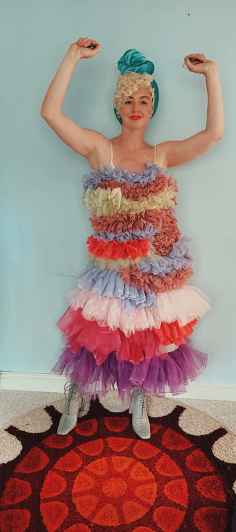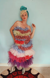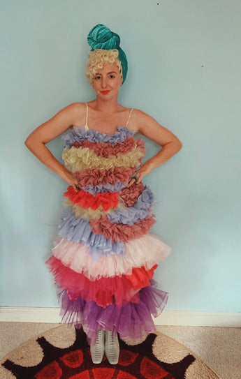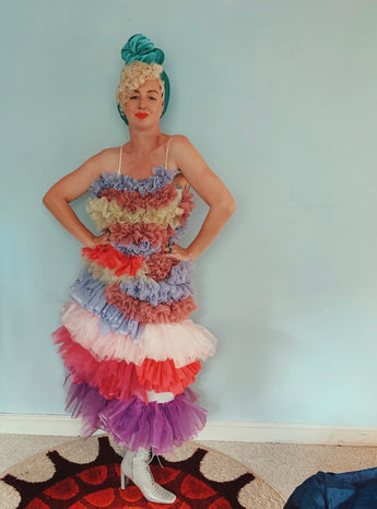 Party season is HERE. In this very dress!!! each ruffle has been hand-stitched individuall before being sewn to the dress base. Only the front is ruffled, please allow for odd bits of fraying as the ruffles are not hemmed. Unlined so you can see the stitching on the inside. Made as a sample piece for a Fumbalinas Shoot.