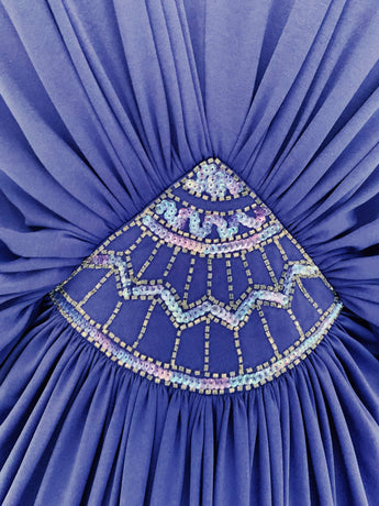 Absolutely JAW DROPPING rare vintage gown from English Designer Trina Lewis. There is lots of fabric to the dress, allowing it to hang and drape in the most beautiful, elegant and flattering way. Made in the 80s but most definitely Art Deco inspired in design with a grecian feel from the beaded waist and batwing arms. She feels absolutely divine to wear and the the long skirt train (please be aware it is long) swooshes wonderfully with movement. In near mint condition the deep purple fabric has an iridescent sequin centre. I collect these kinds of dresses and they don't come around often! This one is now too big for me hence the reason i am selling on....