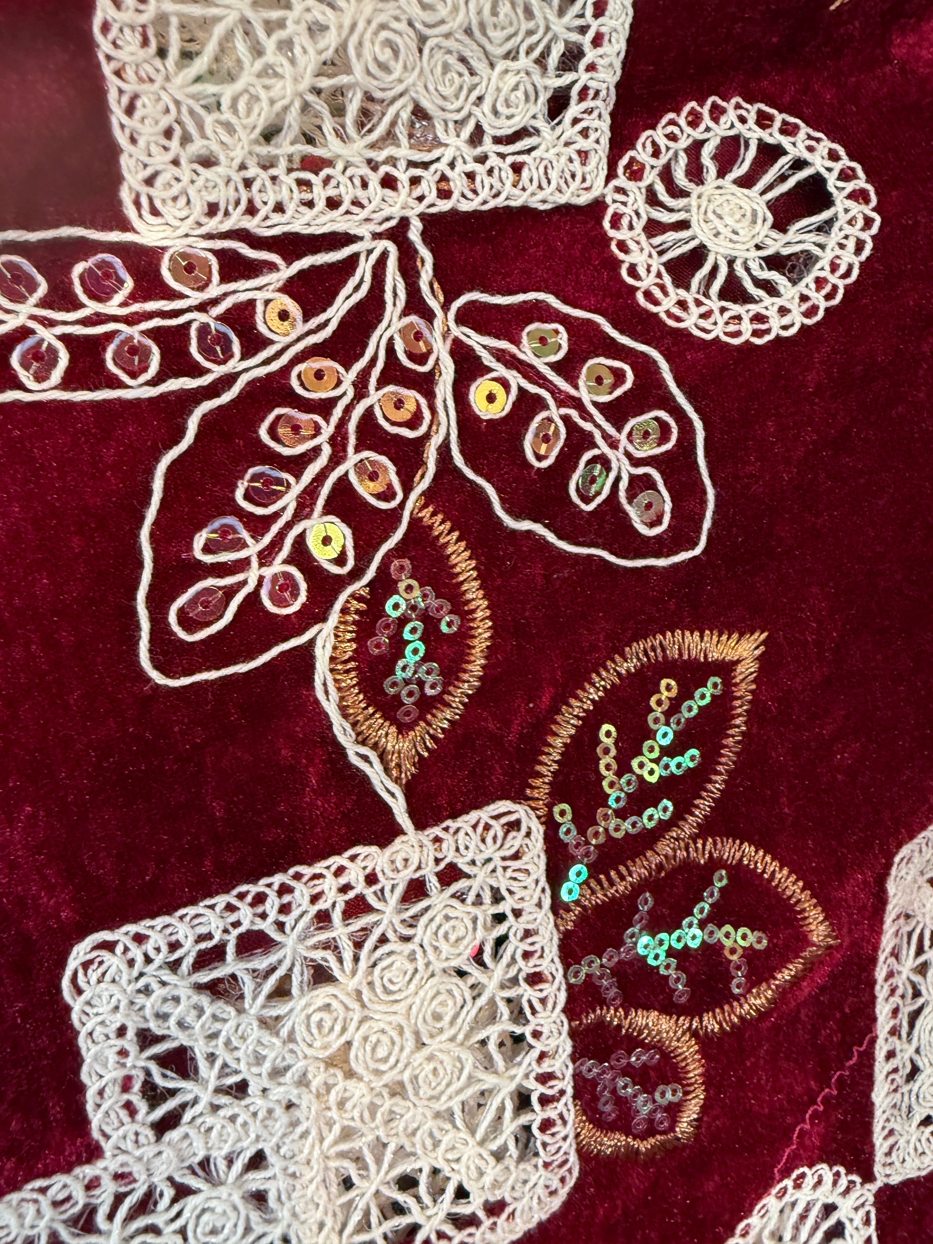 Beautiful velvet lace with sequins and pattered crochet lace and scalloped edges.