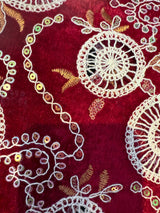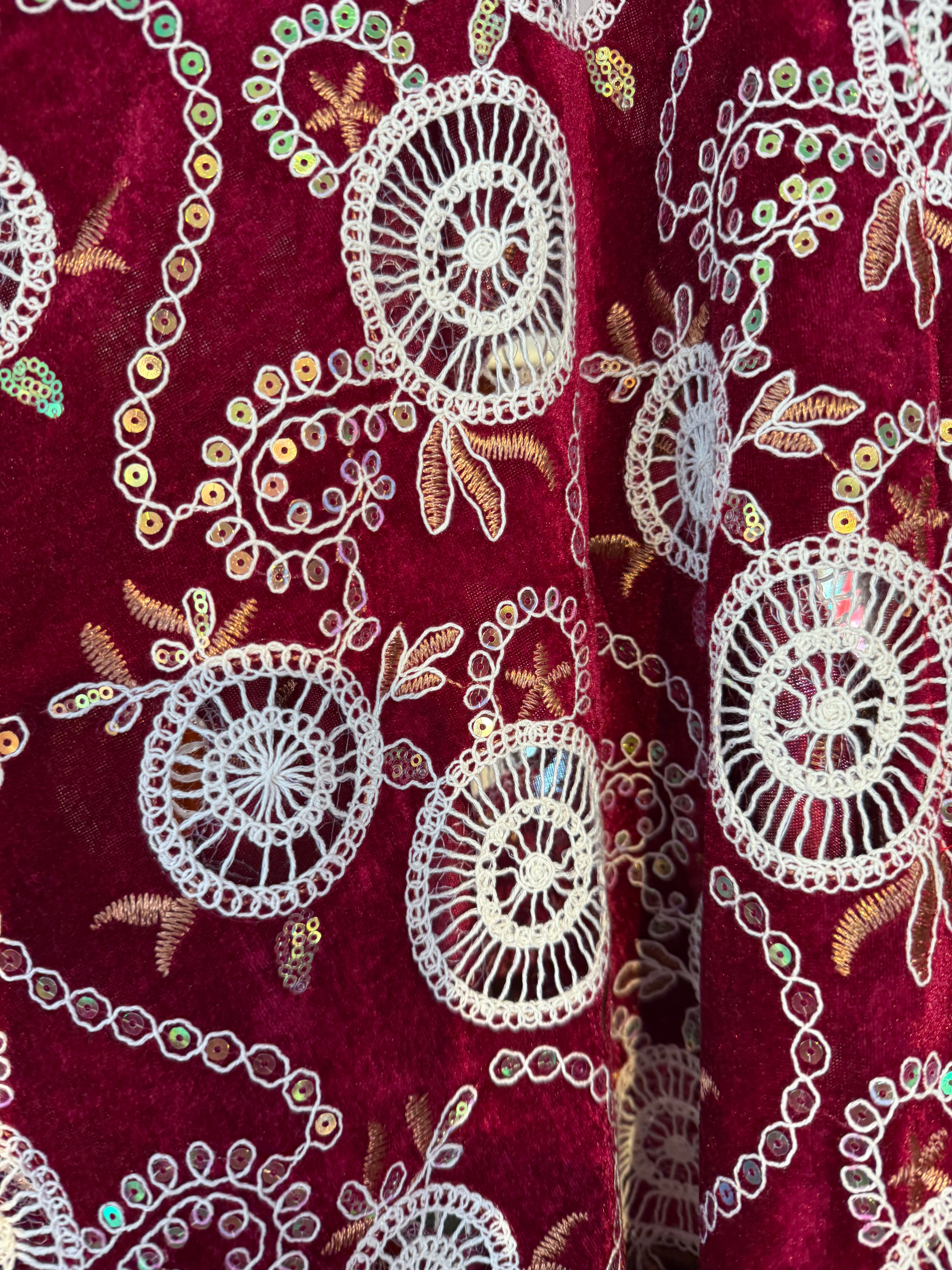 Beautiful velvet lace with sequins and pattered crochet lace and scalloped edges.