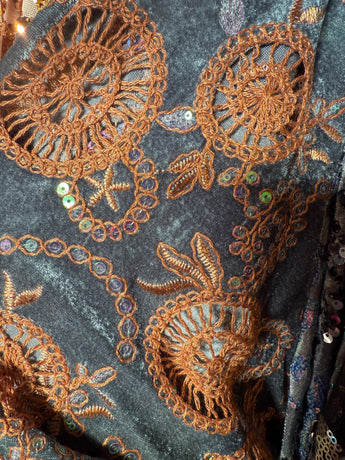 Beautiful velvet lace with sequins and pattered crochet lace and scalloped edges.