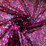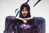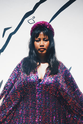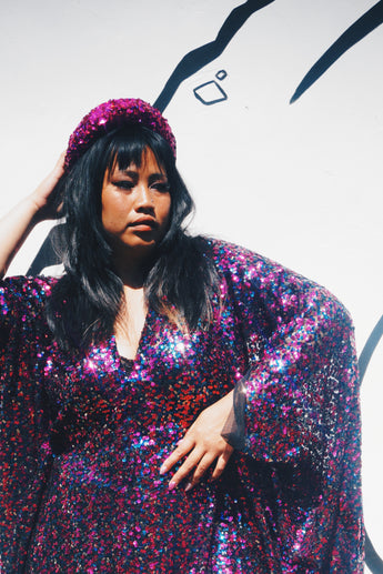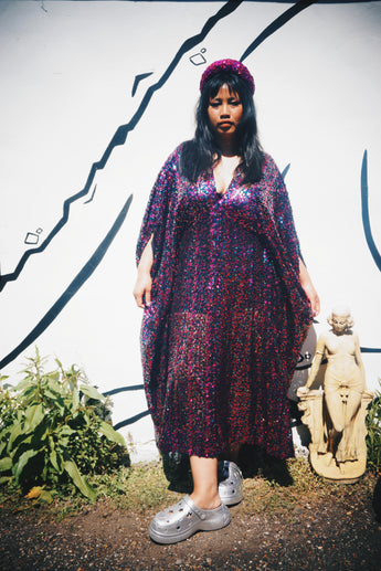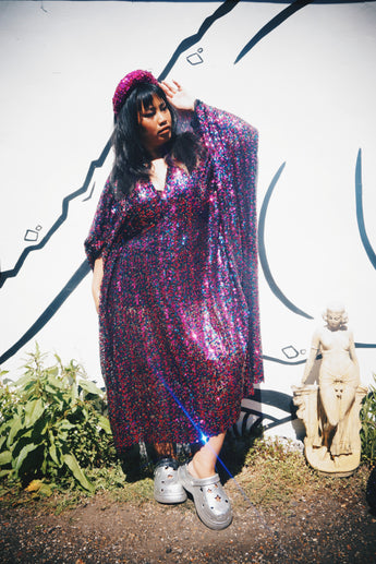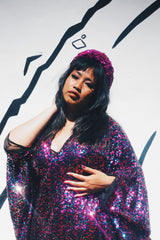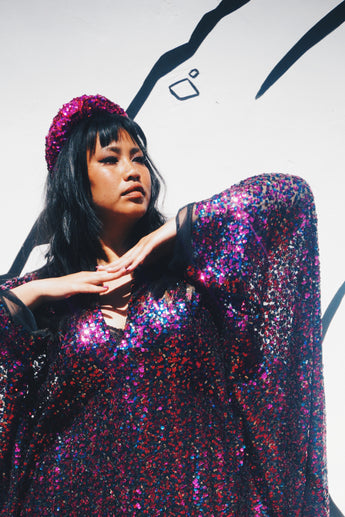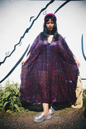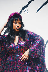 Deep blue and hot pink Sequinned V-Neck Kaftan Gown on a mesh base with some stretch and semi sheer. Very Lightweight. Worn with our hidden ribbons tied to cinch in at the waist (can also be worn loose).