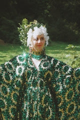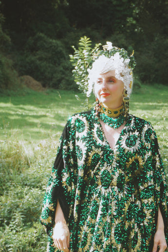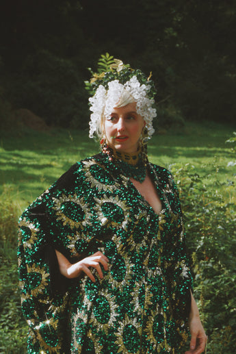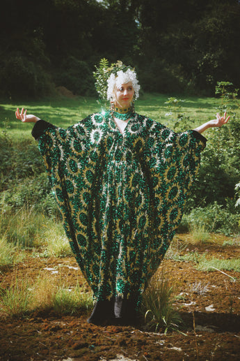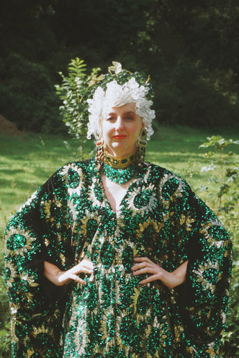 Deluxe Velvet Gold Sunburst Green Sequin Kaftan Gown, Freesize
