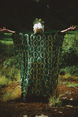 Deluxe Sequin Velvet Green Sequin Gold Sunburst Velvet kaftan Gown on a thick black velvet base. Some stretch and a medium to heavy weight thick fabric.