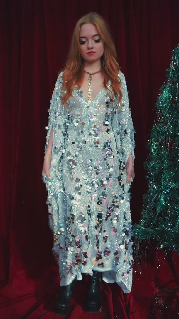 Snow Angel Sequin V-Neck Kaftan Gown. Crafted from iridescent and silver oversized sequins that shift with every move.
