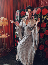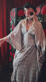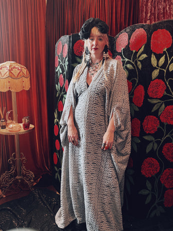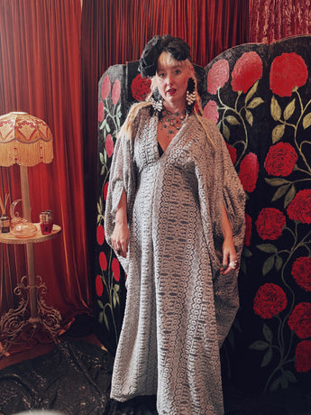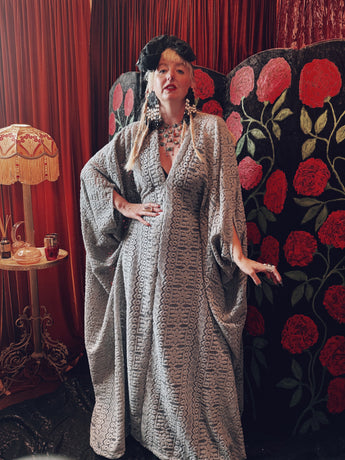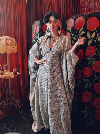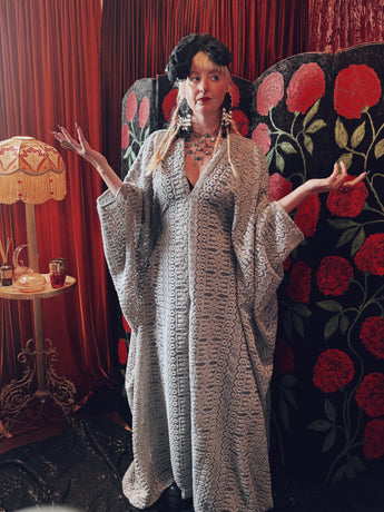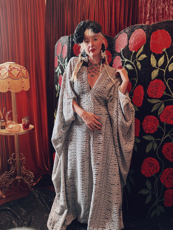 Frosted Crescent lace v-neck kaftan gown. The fabric is a drapey, soft silver-grey lace with a geometric pattern