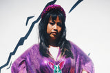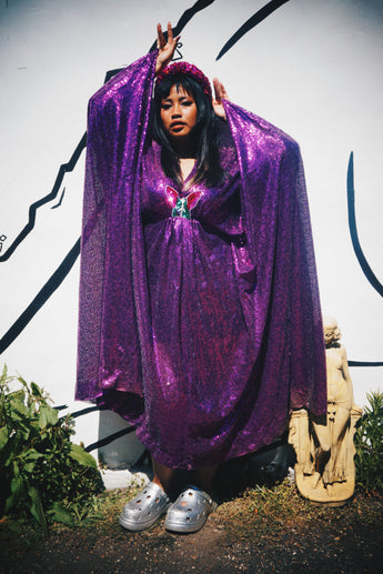 Purple Sequin Love is like a butterfly Kaftan with wings - Extra wide (2 metres) with elastic on the ends so can be worn like wings to hold up the sides if desired. The butterfly central embellishment is a vintage applique and handstitched in place
