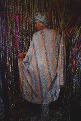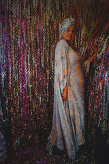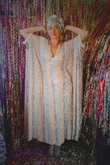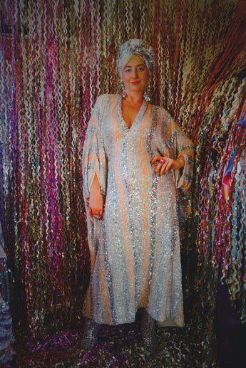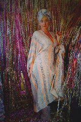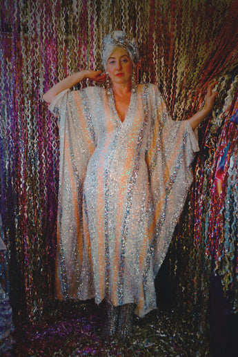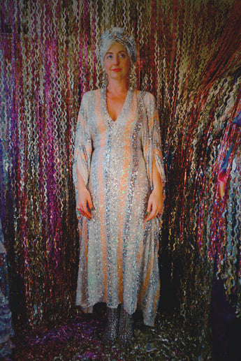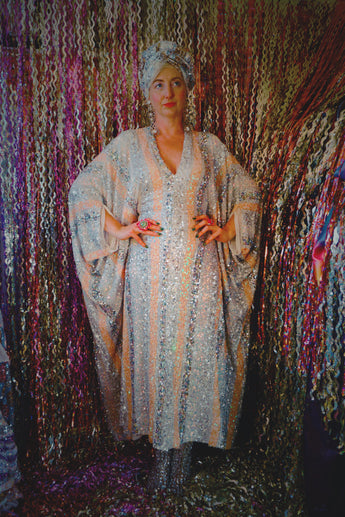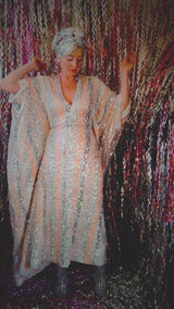 White, Silver, and Peach Stripe Sequin V Neck Kaftan Gown, Freesize