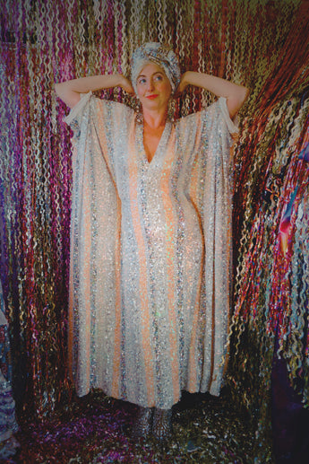 Luxe Mesh stretch Sequin white, silver, and peach stripe pattern v-neck maxi dress kaftan. Choose from a side thigh-high split or standard gown style (standard style pictured)