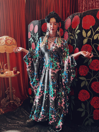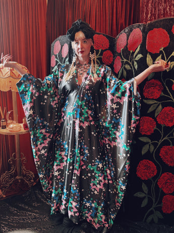 Cosmic Starlight slinky satin v-neck kaftan gown. Lightweight and slinky fabric.
