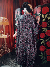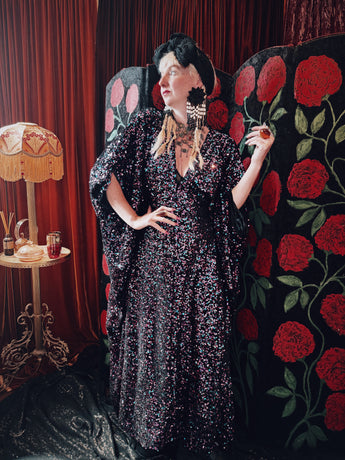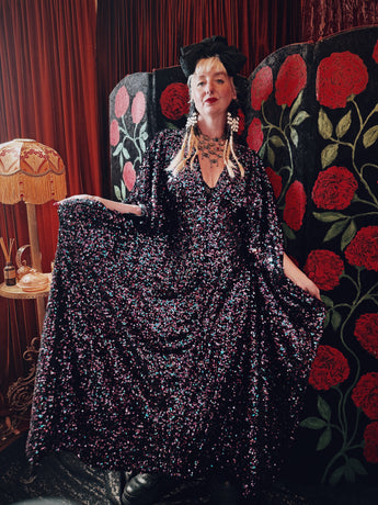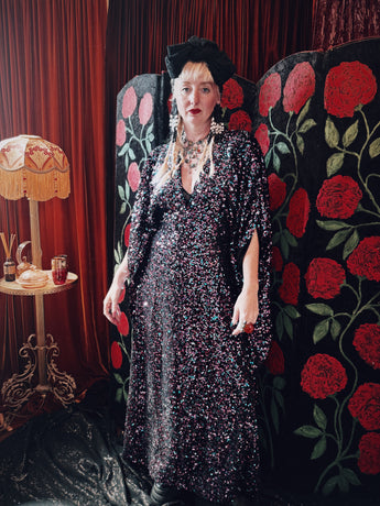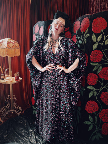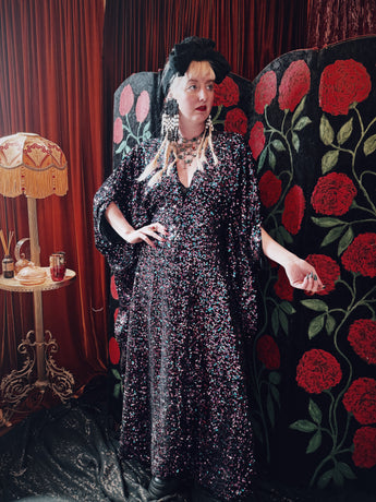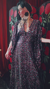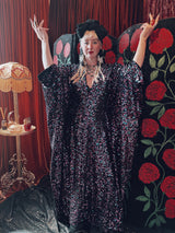 Cosmic stardust velvet sequin v-neck kaftan gown. Crafted from a black sequin base shot through with shimmering sequins in pink, purple, and teal.