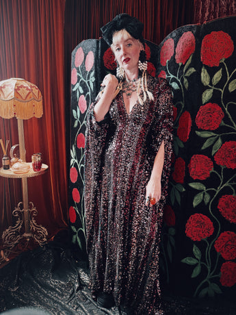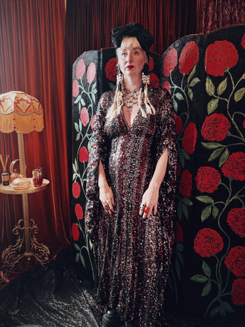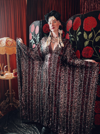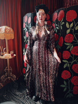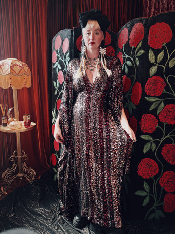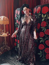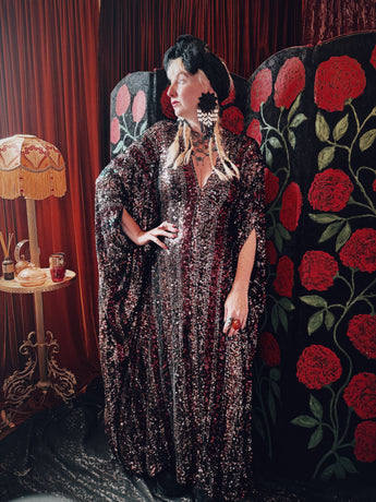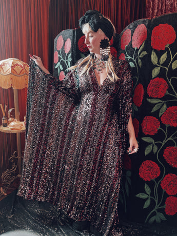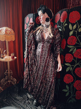 Ombre Bronze and Burgundy Sequin V Neck Kaftan Gown, Freesize