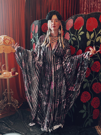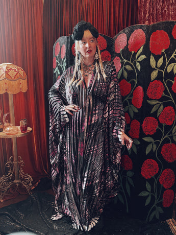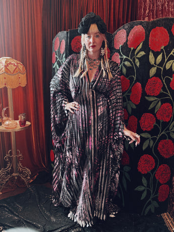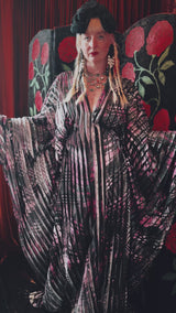 Starlit Veil vertical pleat v-neck kaftan gown. Lightweight and vertical pleat fabric with great movement.