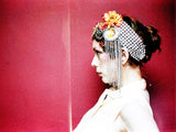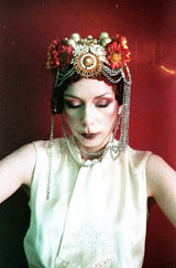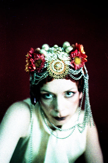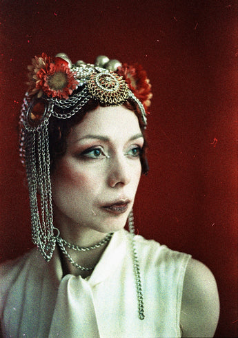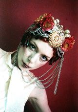 Beautiful chain and jewel adorned headdress. Silver chains, orange flowers and jewels set on a stiffened felt base and elasticated to be adjustable and fit any headsize.
