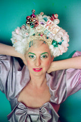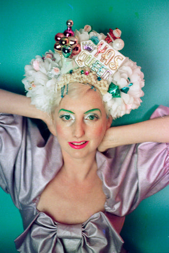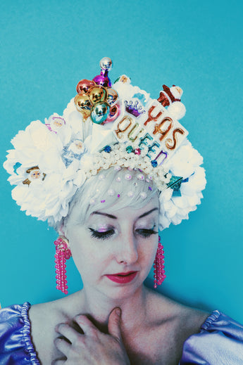 Super fun floral headpiece / flower Crown with big flowers and large "YAS QUEEN" and Party balloon centrepieces, dotted glitter santa's and sequin flowers. Comfortable, and ideal for nights out, parties, Christmas and New Years Eve or any event where you want to sparkle !