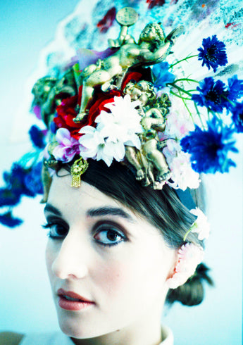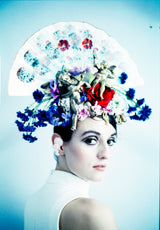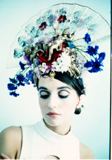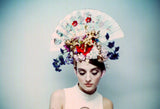 Stunning intricate headdress consisting of deep red velvet flowers, pink and white hyacinths, blue sprays and gold cherubs climbing up the piece. Finished off with a hand painted fan spanning the entirety of the piece.
