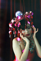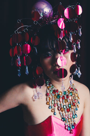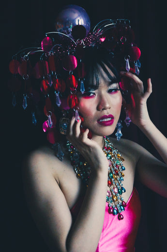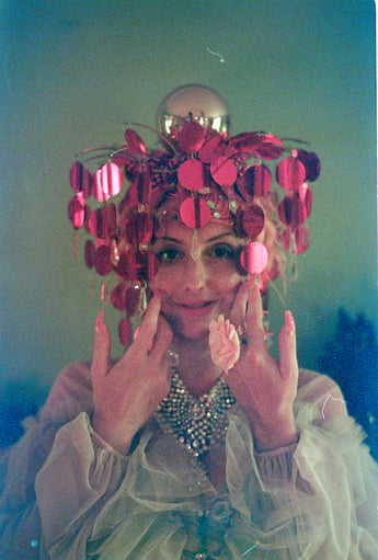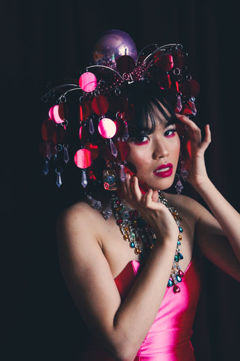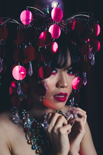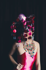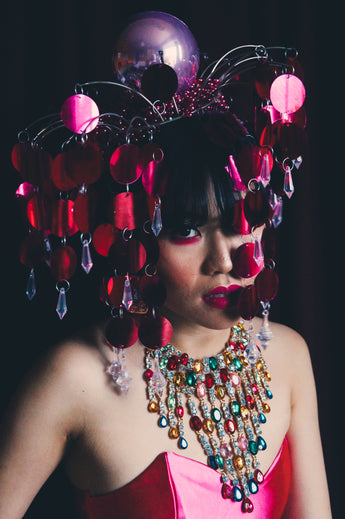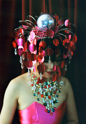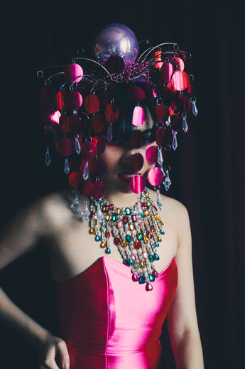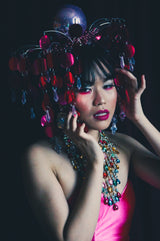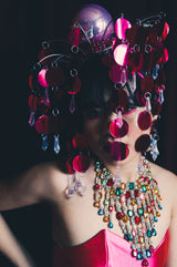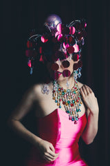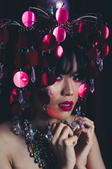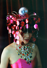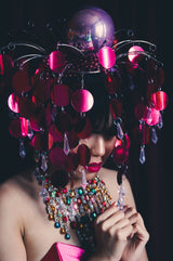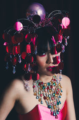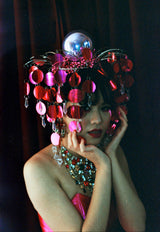 Super fun OTT statement Headpiece made from pink dripping sequins and jewels on a circular wire frame and topped with Christmas baubles and embellishments.