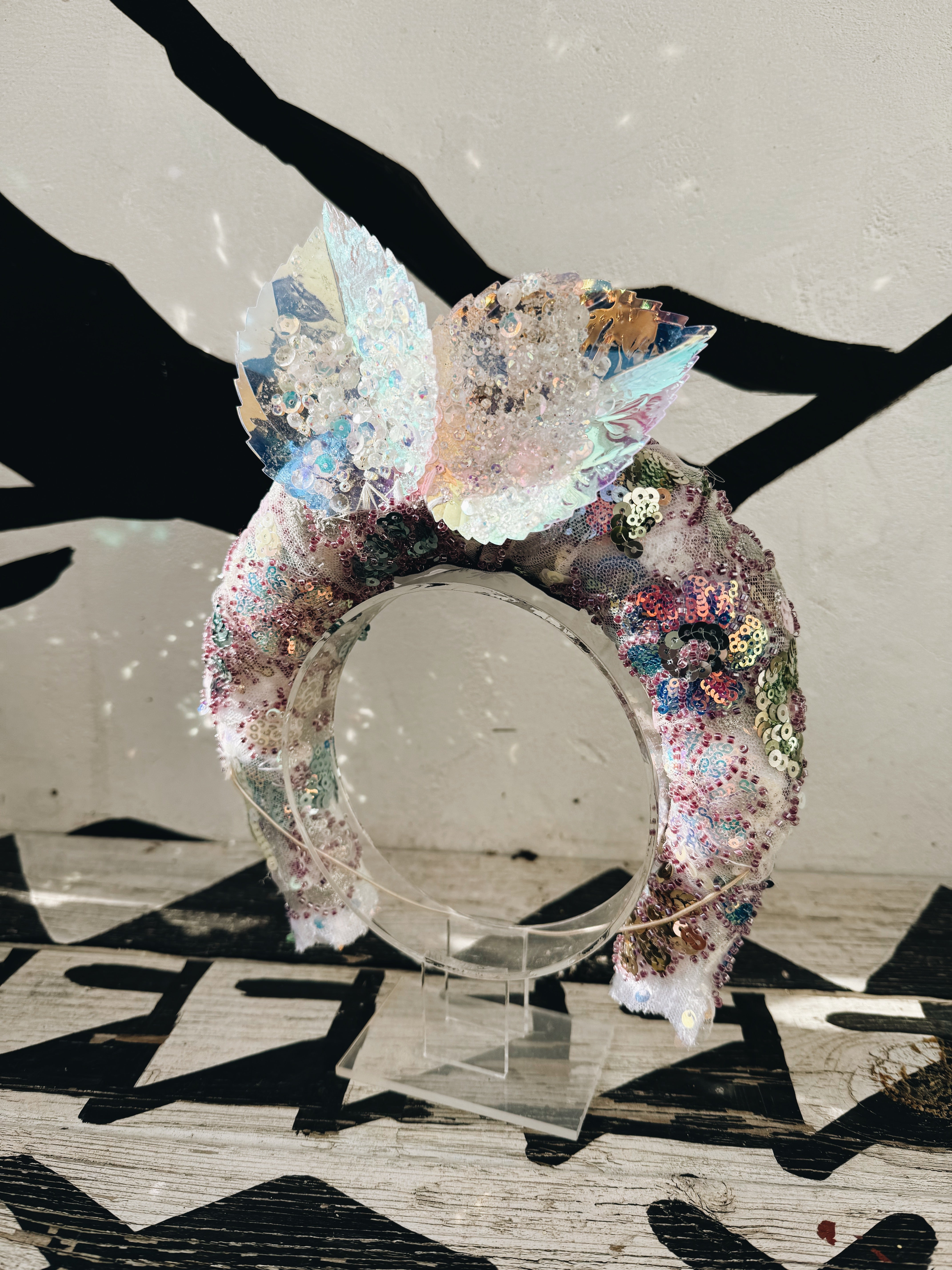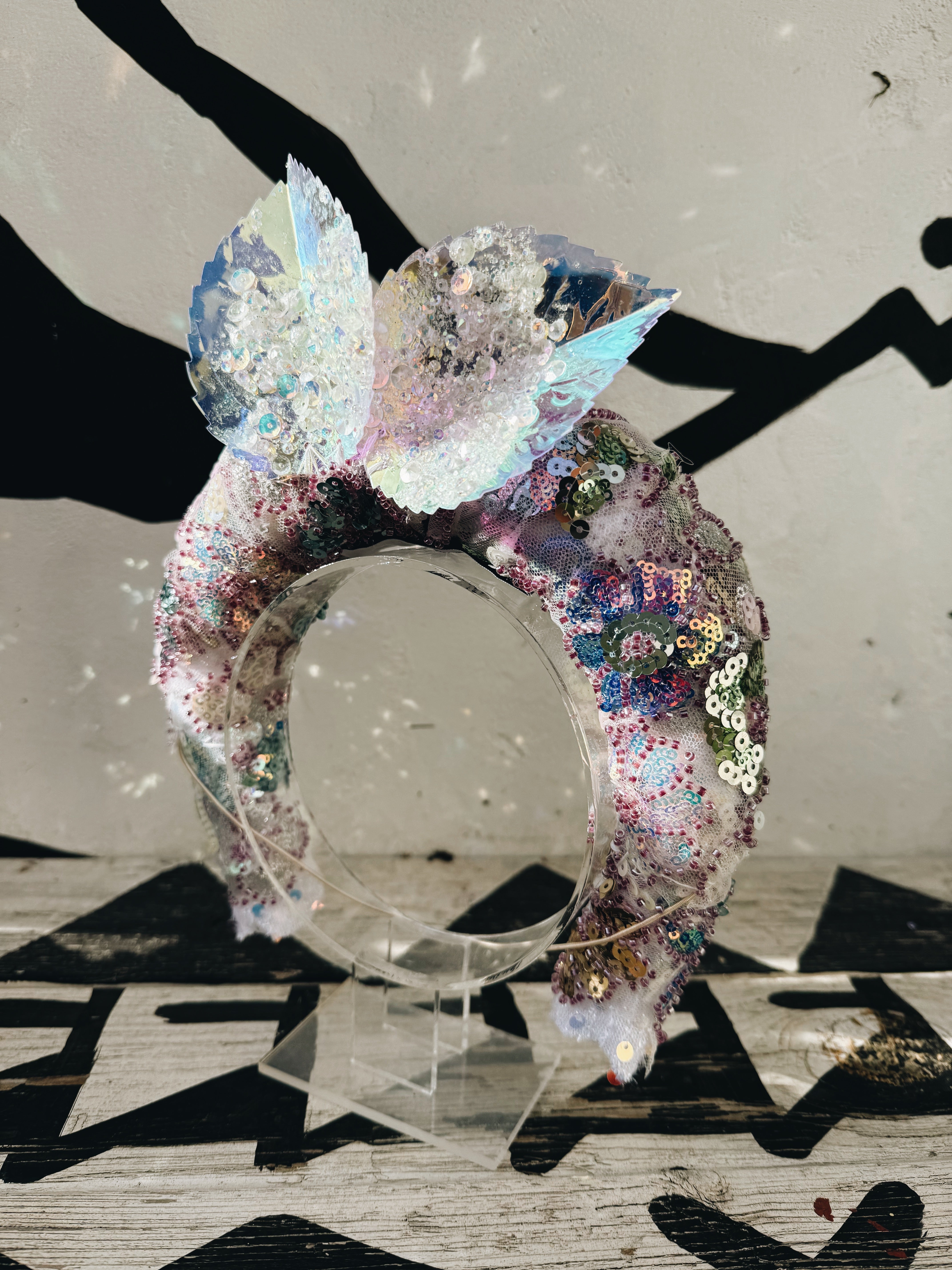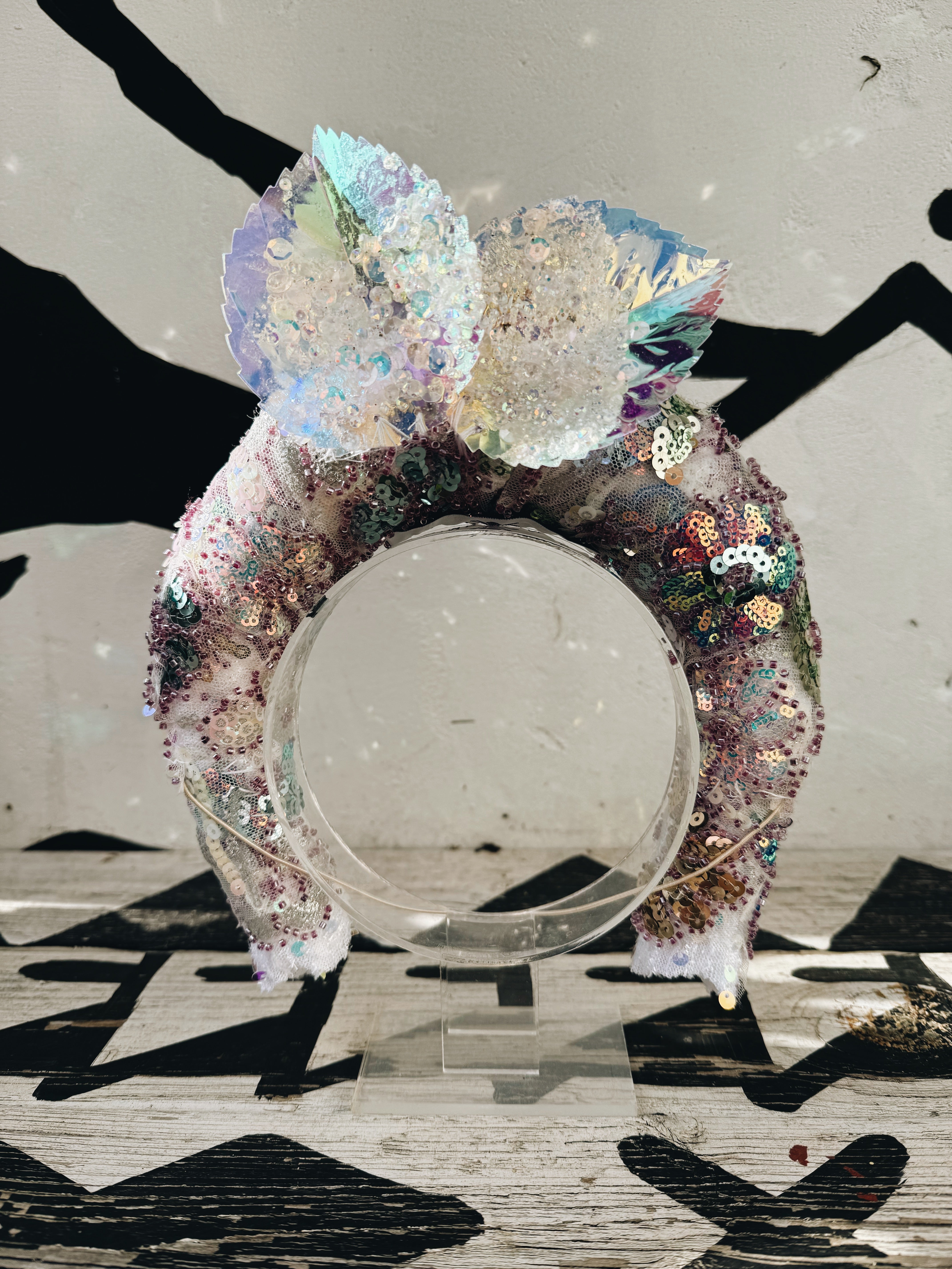 Made from beaded sequin fabric in an icey iridescdent colourway with frosted leaf finish on a padded headband base