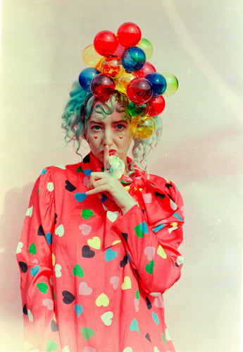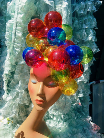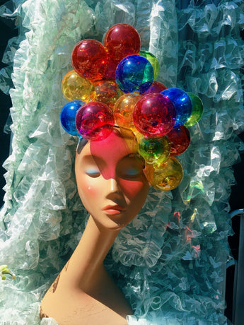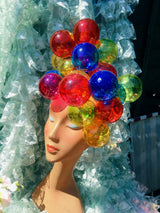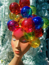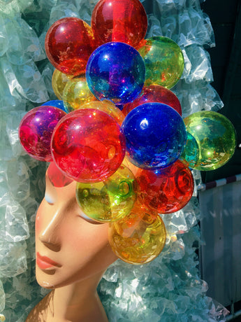 SUPER fun circus clown inspired plastic ball headdress. Can be worn either side of the head by reversing the piece. Lightweight and comfortable.