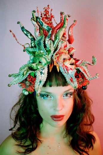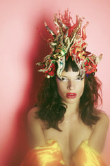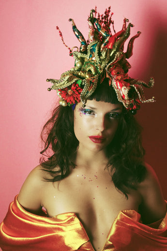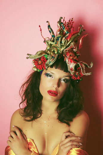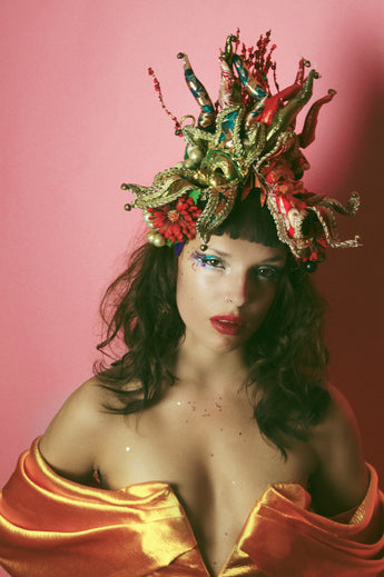 Masquerade mask Headdress! Inspired by the film 'The Labyrinth' the two masks sit either side of the head with wired legs on top and bottom so they can be styled to your liking. Flowers, grapes in black and gold/silver adorn the sides, and a firey glitter orange spray central back.