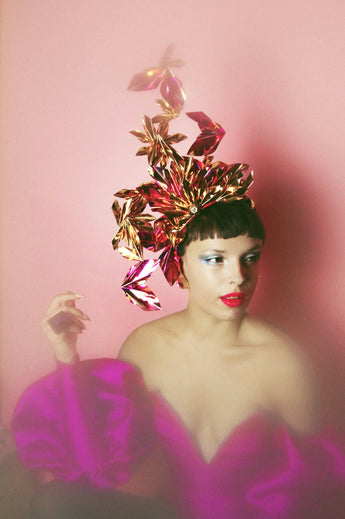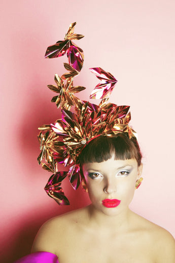 An Array of metallic origami pieces - all hand cut and folded and arranged into a structural shape which can be worn on either side or middle of the head. Available in a range of colours - Please message me for photo colour references. Very lightweight and comfortable, and ideal for nights out, parties, Christmas and New Years Eve or any event where you want to sparkle !