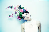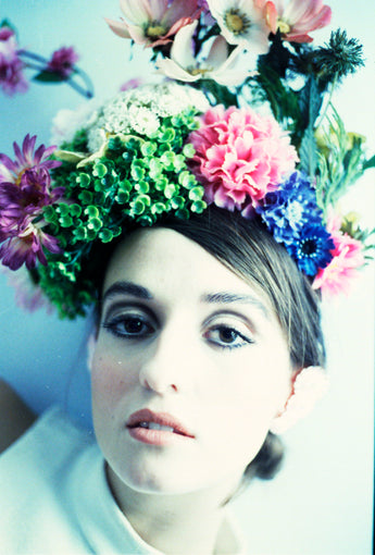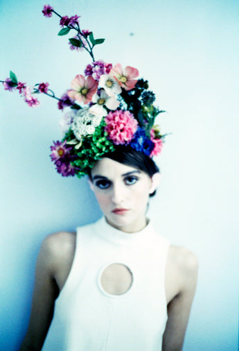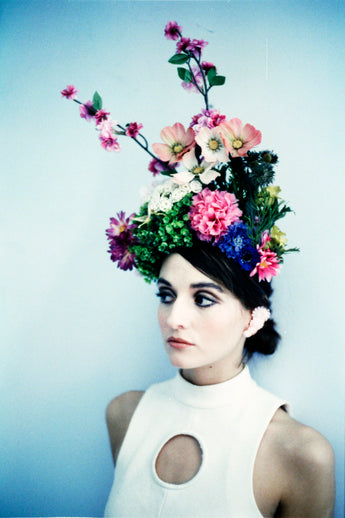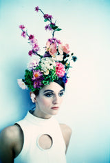 EXTRAVAGANT giant floral headdress consisting of a huge amount of plastic and vintage flower and buds and sprays in all colours - very alice in wonderland inspired.