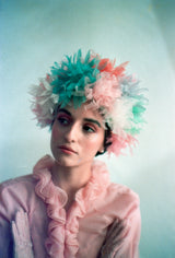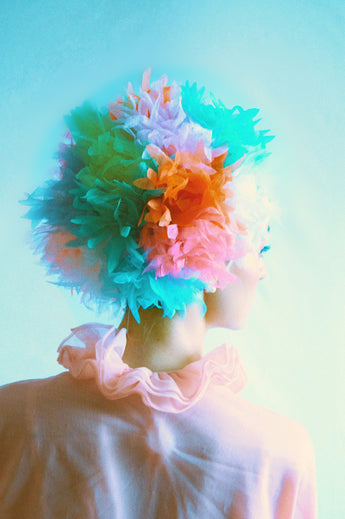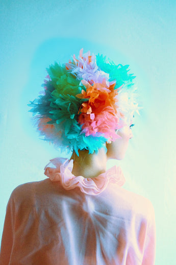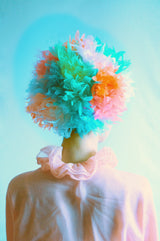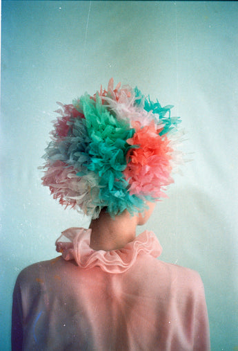 Beautiful tissue like ruffle flowers on a stiffened felt large hat base covering the whole head. Extremely lightweight and available multicoloured as pictured or as any single colour or colour combination listed below (please specify when ordering)