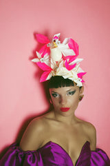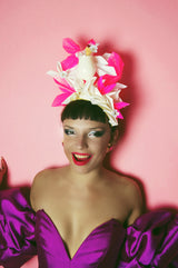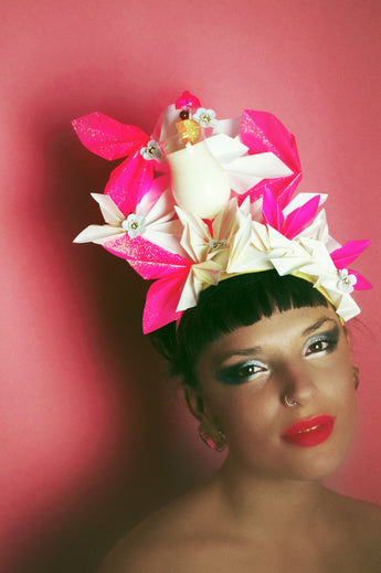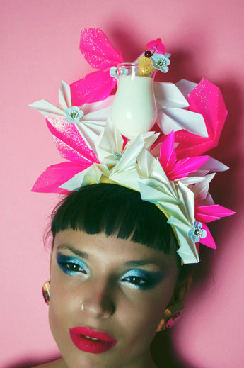 A very fun Cocktail Party Headpiece. A central plastic Cocktail is surrounded by handcut and folded origami segments in a neon pink Glitter, Matte Bright pink and Glossy white. Very lightweight and comfortable, and ideal for nights out, parties, Christmas and New Years Eve or any event where you want to sparkle !