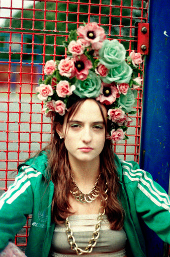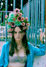 Vintage pastel coloured plastic vintage roses headdress formed in a huge crown fit for a queen. Arranged on a stiffened felt base and elasticated with elastic which sits at the nape of the neck for comfort and stability.
