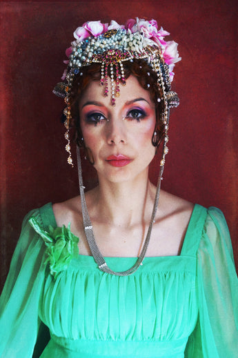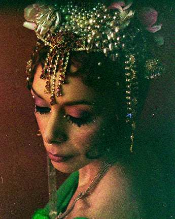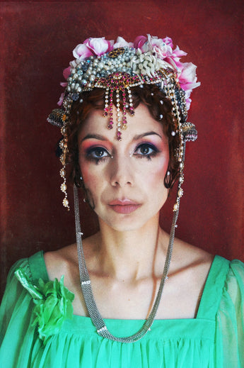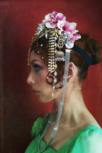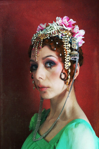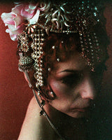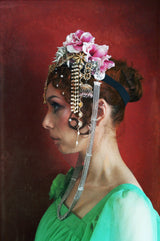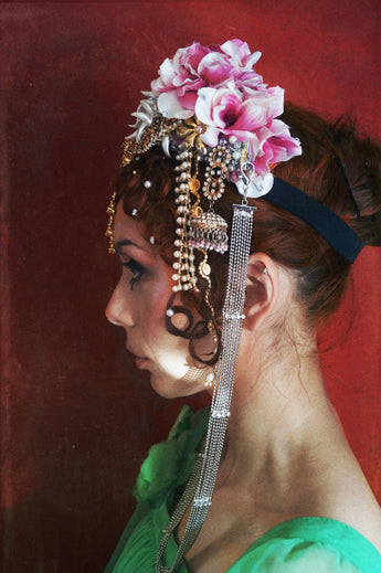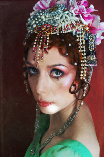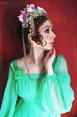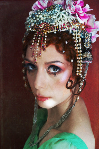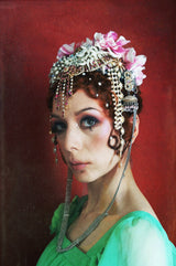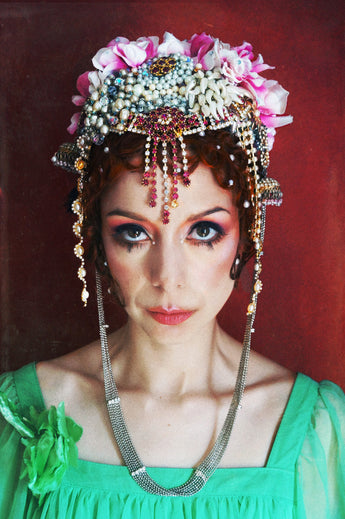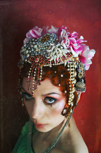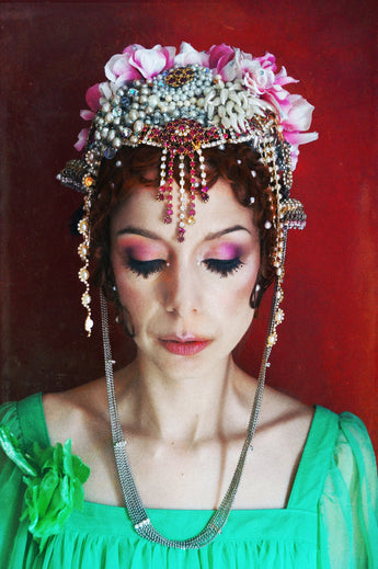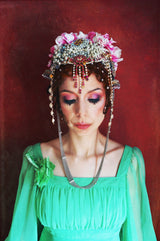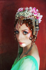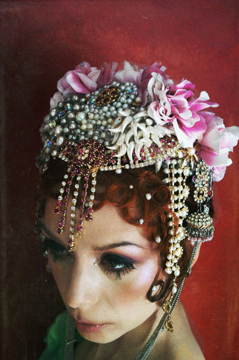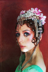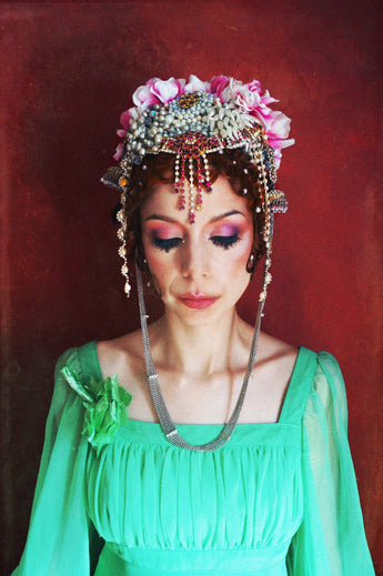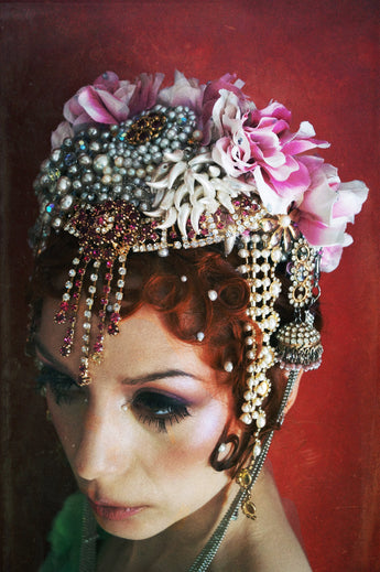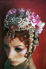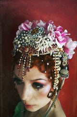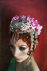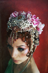 Handmade headdress dripping with vintage jewels and pearls and pink flowers.