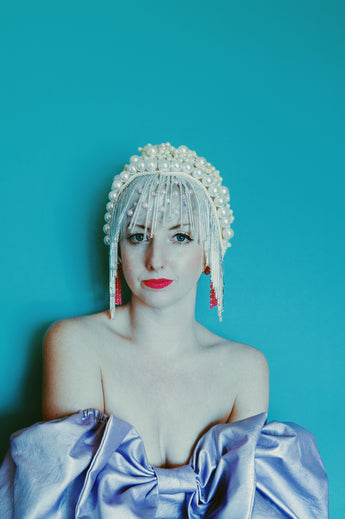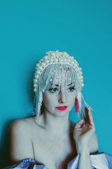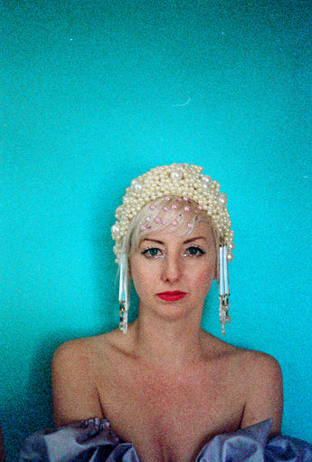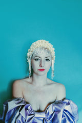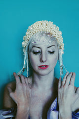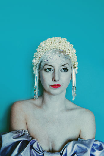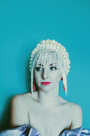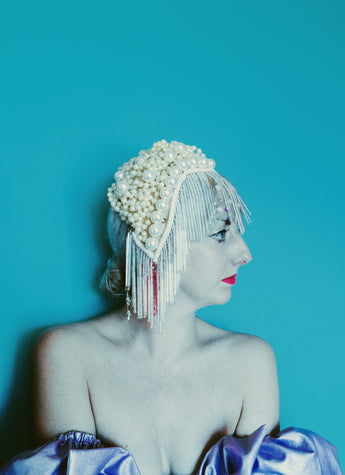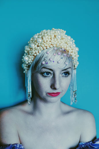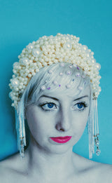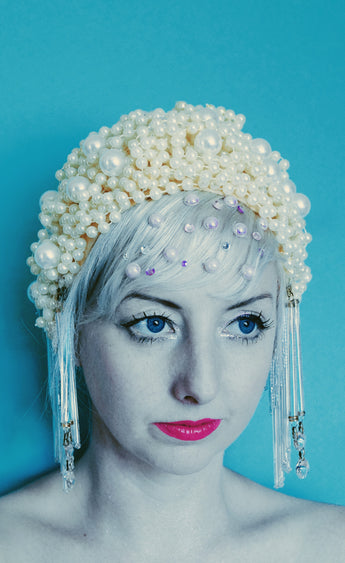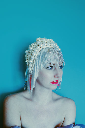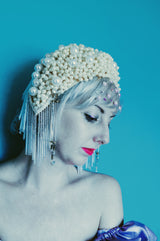 Plastic Pearl Encrusted headdress / skullcap. Can be worn with either side as the front or back (one side Fringed with vintage glass dripping beads). Hundreds of faux pearls in various sizes adorn this one off bespoke piece. Something similar can be made as a commission on request. Please get in touch for further details.
