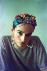 Intricate Floral headband with a mixture of multicoloured flowers and central iridescent jewel.
