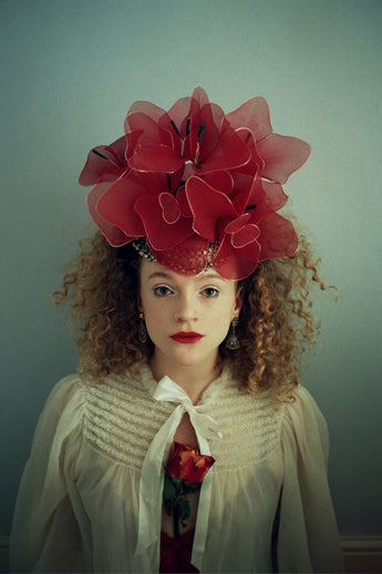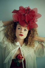 Handmade Wired red net flowers arranged on an elasticated felt base for comfort and to fit any headsize.