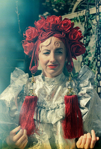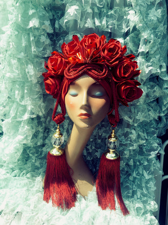 Red Roses turban with dangling red jewelled tassels and metallic origami inserts. Will fit any headsize. Comfortable and easy to wear / move around in.