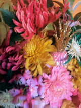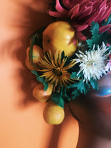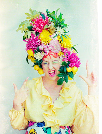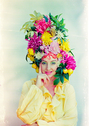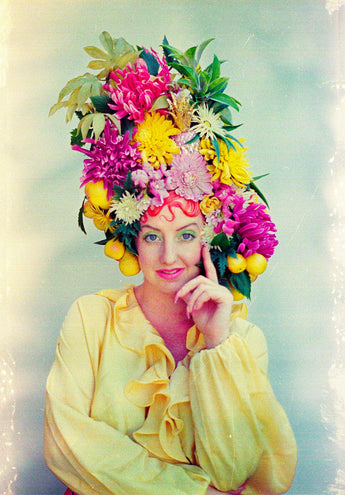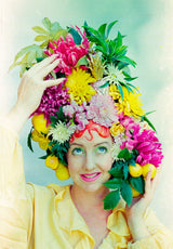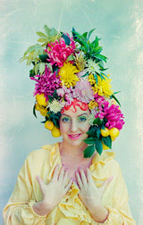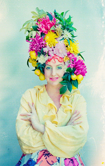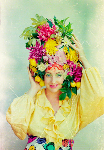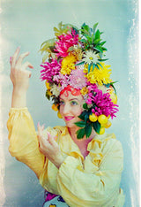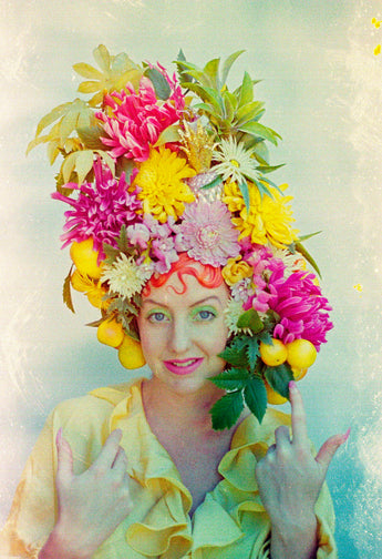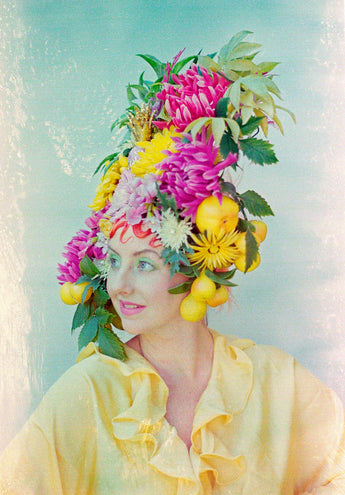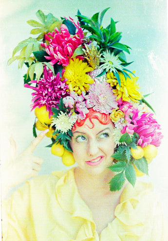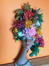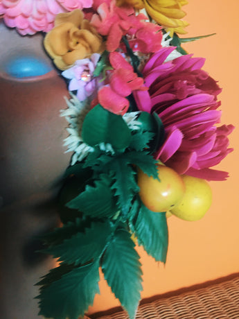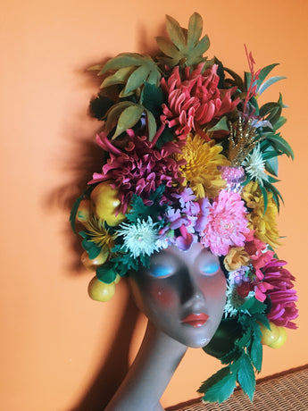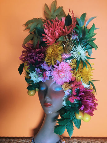 The headdress itself is made up of vintage plastic flowers and fruit (complete with pink and gold glittery pinapple)! and is securely attached to a stiffened felt base with elastic stretching at the nape of the neck to allow for comfort and security and to fit any headsize. It also makes a great performance, display or art piece. It is quite heavy due to the size but stable and secure.
