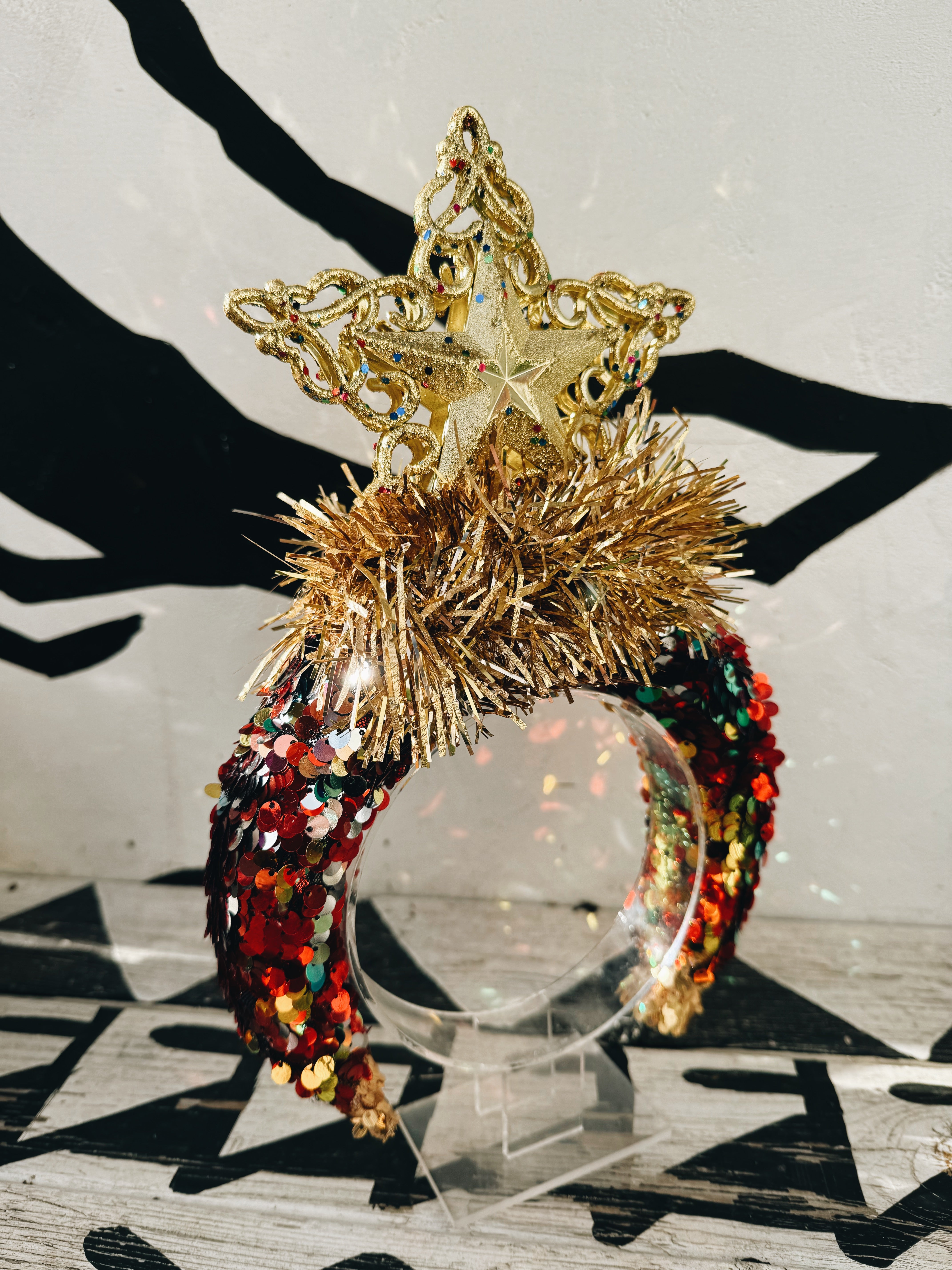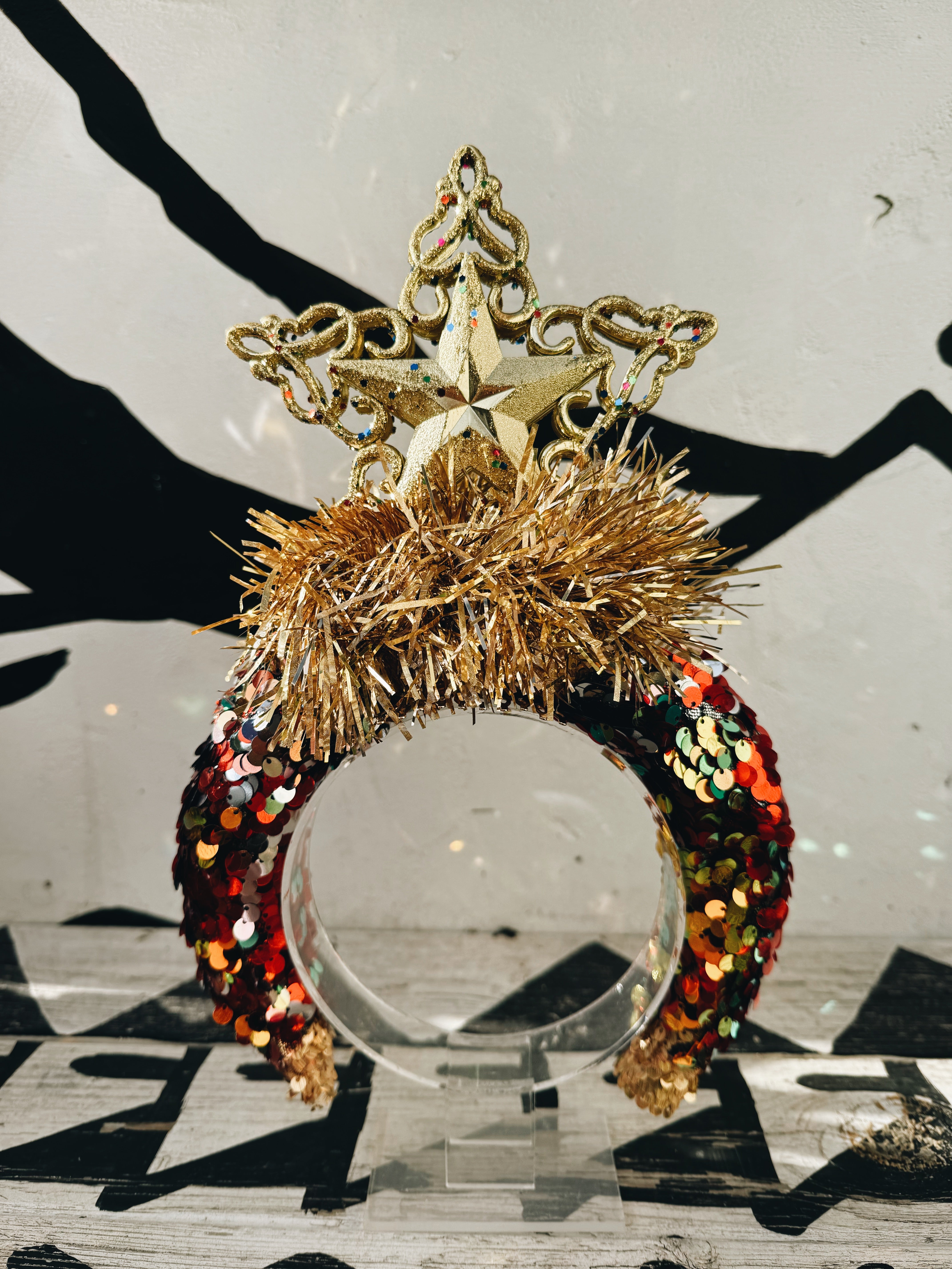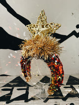 Shine brighter than the tree with the Star of Christmas Crown. Built on a padded, red sequin-covered headband, this dramatic design is topped with a gold tinsel explosion and a shimmering star.
