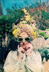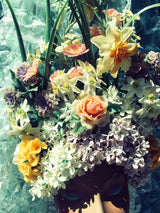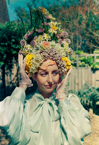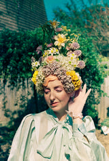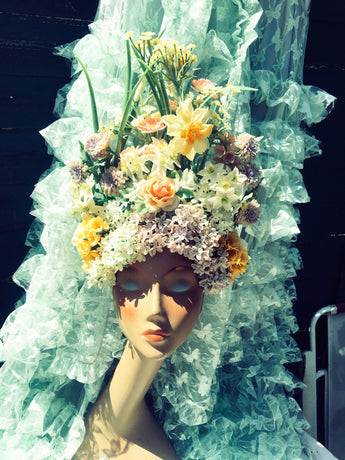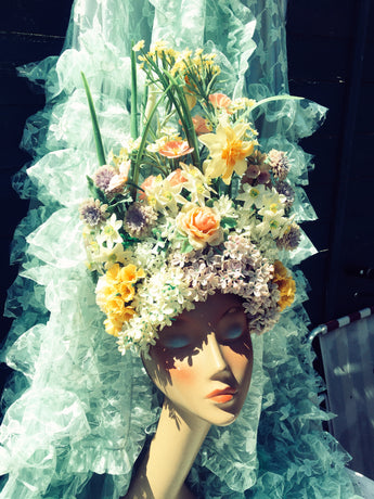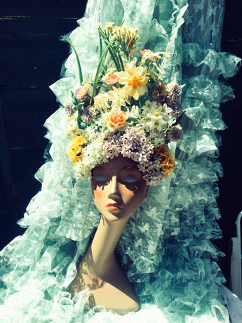 Beautiful vintage flowers and blossoms adorn the top of the head up to a peak, forging a crown fit for a queen. Only one of its kind in existence including the flowers used to make the piece. Comes attached to a fitted felt base which is elasticated to sit round the back of the head / nape of the neck for comfort and stability.