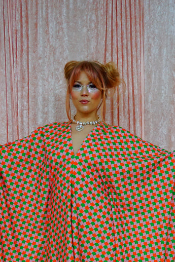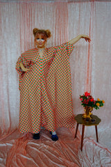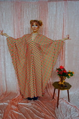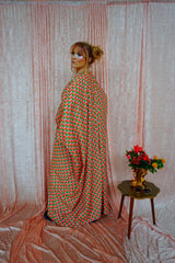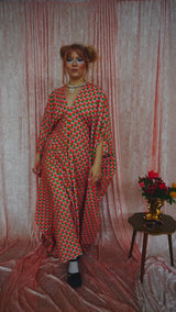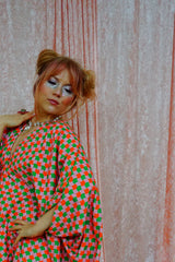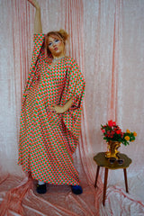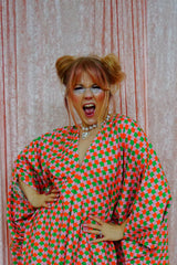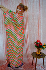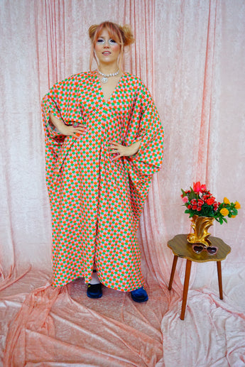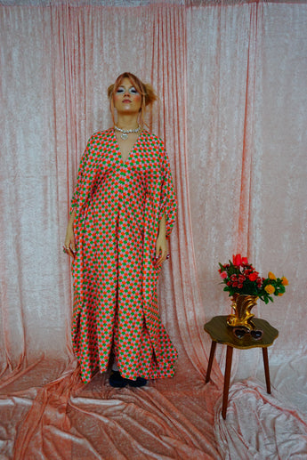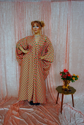 This v-neck kaftan gown features a geometric pattern of Pink, Orange, and Green in a corduroy fabric. Lightweight with no stretch