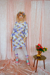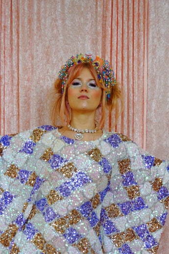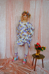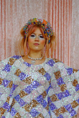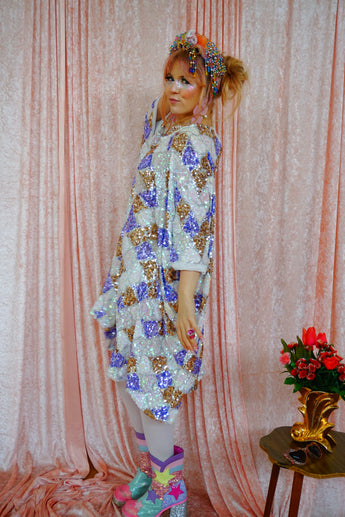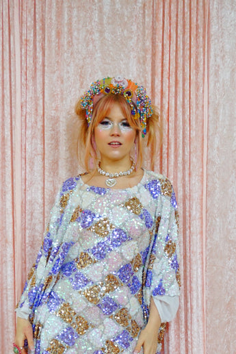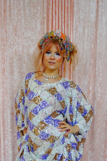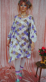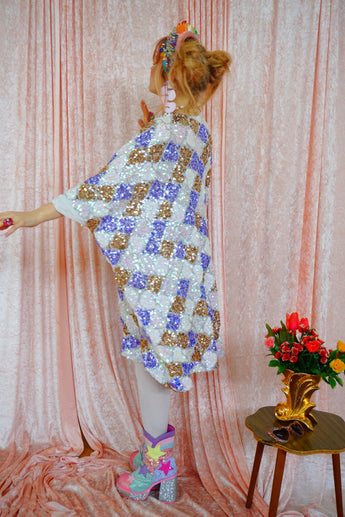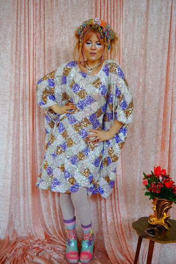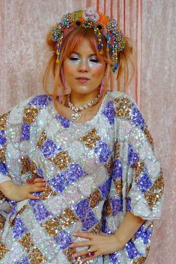 Lavender, Gold, and Pearlescent White Geometric Print Kaftan Mini. Super sparkly sequins on a stretchy mesh base. Worn with our hidden ribbons tied to cinch in at the waist (can also be worn loose).