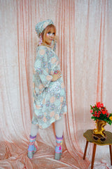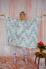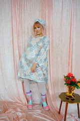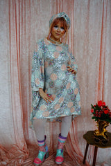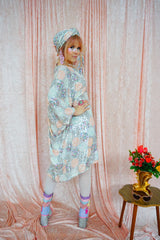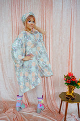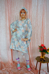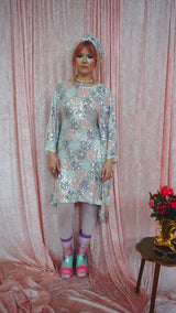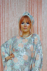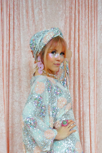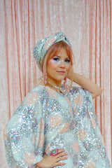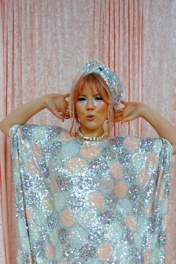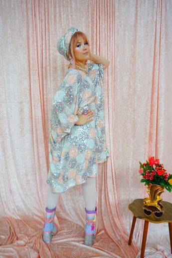 Pastel Polka Dot Pattern Sequinned Kaftan Mini. Super sparkly sequins on a stretchy mesh base. Worn with our hidden ribbons tied to cinch in at the waist (can also be worn loose).
