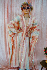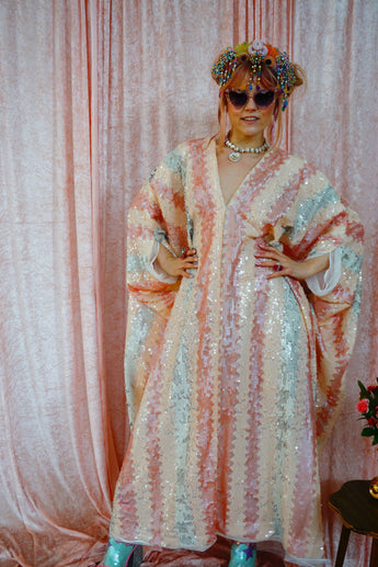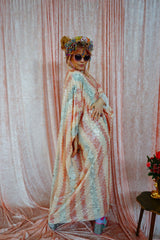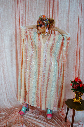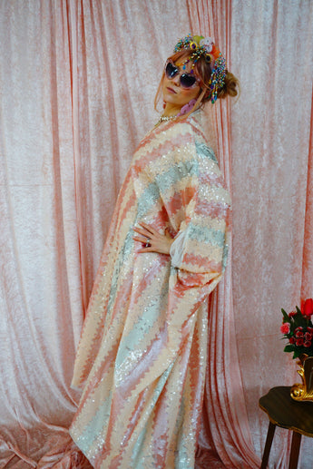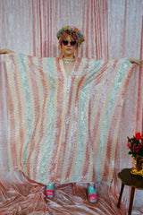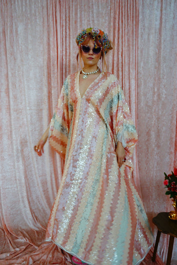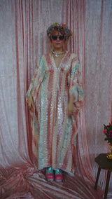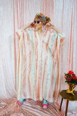 Pastel Zig-Zag Striped V-Neck Maxi Kaftan Gown on a mesh base with a small amount of stretch. Worn with our hidden ribbons tied to cinch in at the waist (can also be worn loose). The centre of the kaftan will always be the shortest length, as our kaftans are designed to be longer at the sides than at the front to create a draped, bell sleeved effect.
